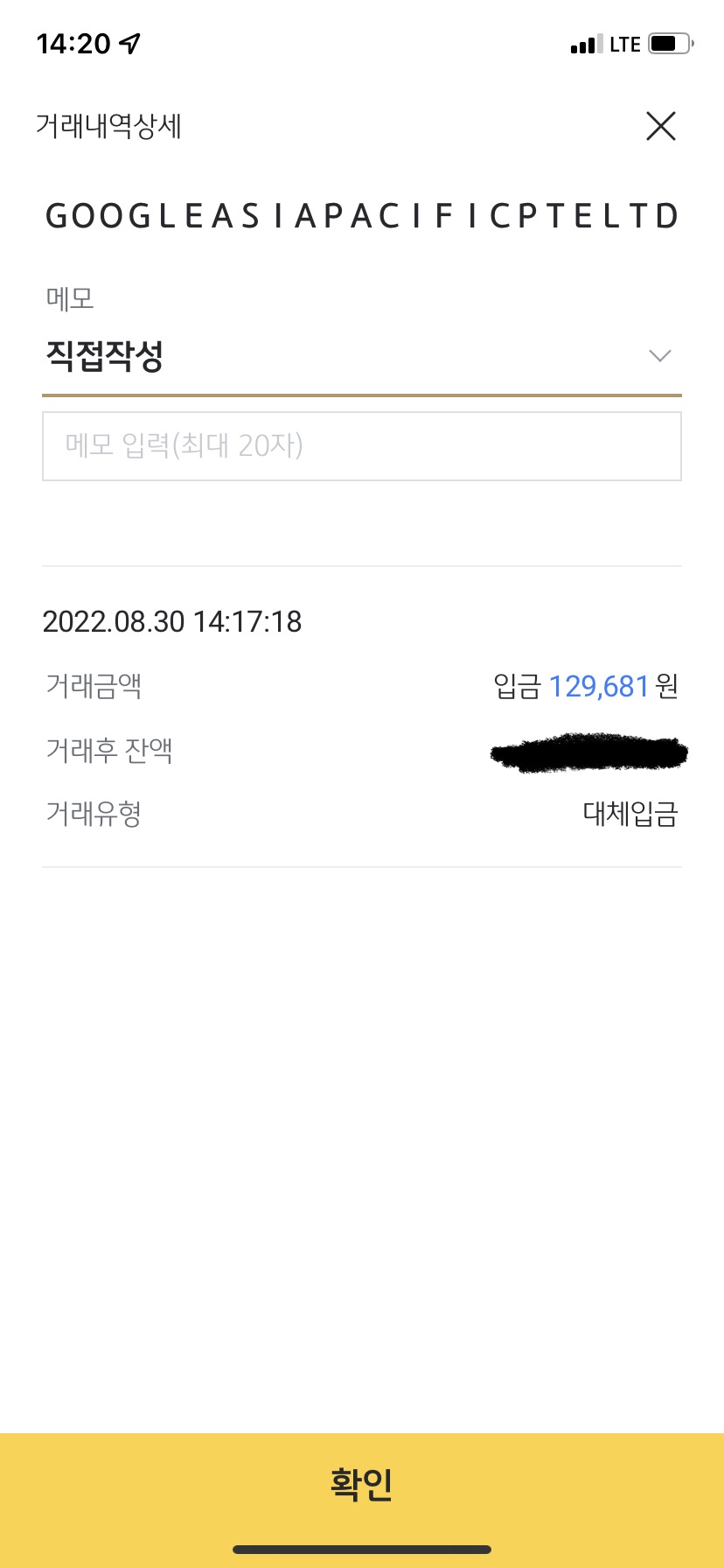 수익 발생 작년 12월 8일부터 애드센스가 승인되어서 조금씩 수익이 발생하고 있었습니다. 그렇게 거의 8개월이 지났는데, 드디어 첫 수익을 정산받을 수 있었습니다 🎉 총 US$104.63가 정산되었는데요, 현재 환율로 계산해보면 약 14만 원 정도 됩니다. 하지만 저는 국민은행을 통해서 수익금을 지급받았고, 국민은행은 해외송금을 받을 때 건당 1만 원의 수수료가 부과됩니다 😢 물론 US$100 미만의 경우에는 수수료가 면제되지만, 애드센스는 US$100 이상부터 출금이 가능하기 때문에 큰 의미는 없겠네요. 그래서 결과적으로 오늘 입금된 원화 금액은 아래와 같습니다. 작고 소중한 수익이 발생했네요 🤭 나중에 수익이 더 늘어서 자주 출금할 일이 생긴다면 기준 금액을 올리는 것도 도움이 되겠지만, 저는 지금 ..