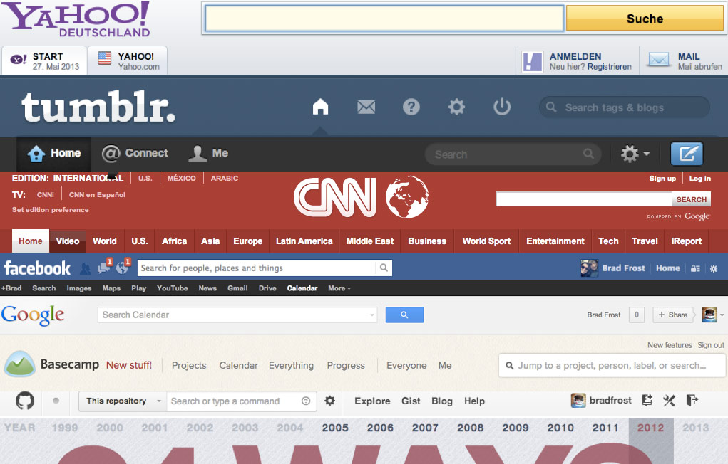 템플릿은 매우 구체적이면서도, 상대적으로 추상적인 분자들과 유기체들에 컨텍스트를 제공합니다. 템플릿은 클라이언트가 최종 디자인을 보기 시작하는 곳이기도 하죠. 제 경험상, 템플릿은 HTML wireframes에서 시작되지만 점차 정확도가 높아지면서 최종 제품이 됩니다. 피츠버그의 Bearded Studio도 비슷한 프로세스를 따르고 있습니다. 이 프로세스에서는 grayscale과 layout-less한 디자인에서 서서히 정확도를 높여 최종 디자인으로 발전시킵니다.